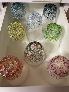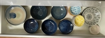 最上段に小さい引き出しが4つありますが、一つは小皿と蓋つき小鉢、一つはカトラリー、一つはスープカップを仕舞っています。