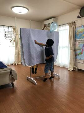 ある日、「どうせ干すならネット代わりにして、遊んじゃえばいいよね!」と思い立ち、敷きパッドを干しがてら、体力持て余すボーイズに「風船バレーやってみる?」と言ってみたら、3人ともめっちゃ楽しく過ごせました。