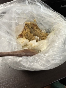 米に水を入れる時も、親子丼の材料を投入する時も、このようにポリ袋をボウルに被せて作業するとやりやすいです。